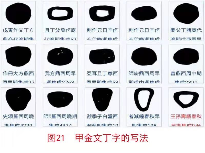甲骨文和金文全都用不规则圆的形状表示丁(见图21),丁字在甲骨文中的意思通工具,图中的丁字形状与打磨凹穴岩画的石器工具非常的相像。我们将思绪退回到凹穴文化的那个年代,同样会将凹穴的形状和工具的形状联系起来,绘制出同甲金文雷同的丁字符号来。