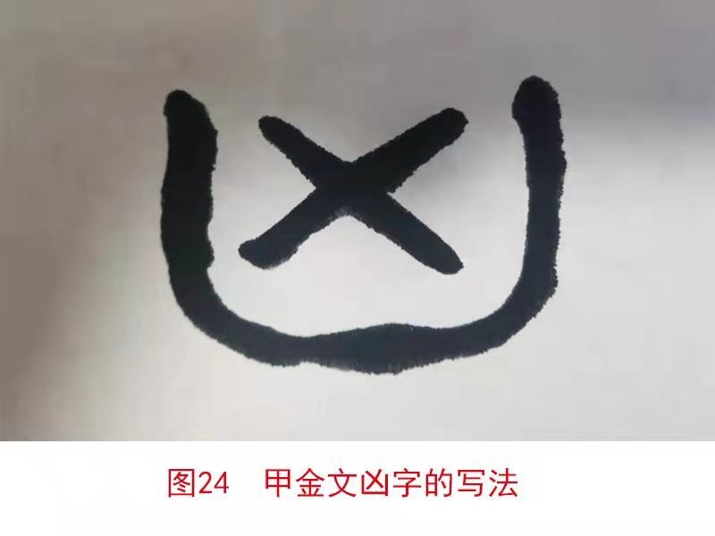 凶在甲骨文中用一个凹穴和一个叉来表示(见图24),这里就很容易理解了,在占卜活动中,没有神圣的凹穴或者不诚心制作凹穴一定是预示着凶相。