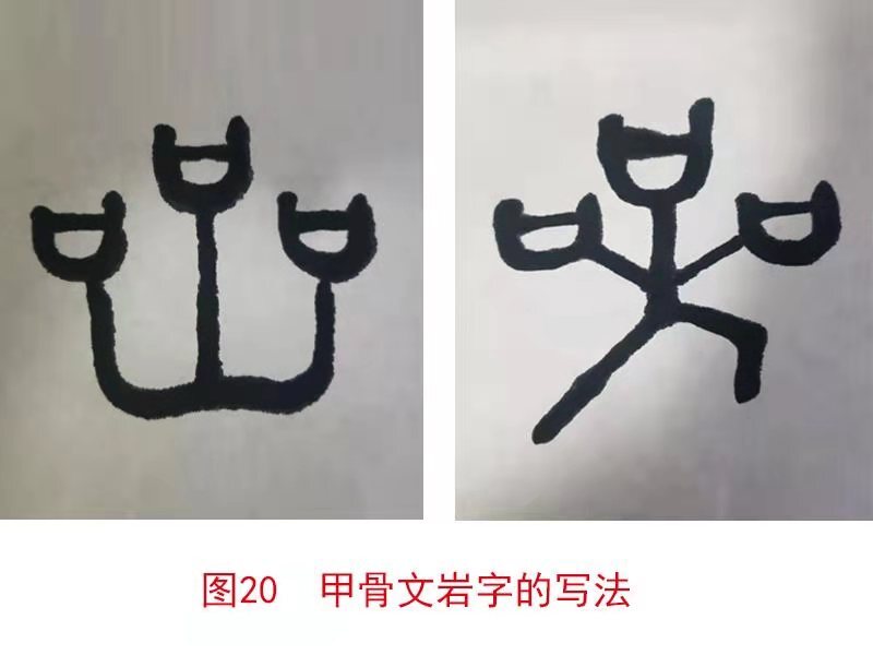 岩在甲骨文中为山上三个口,另一种写法是一个人上面三个口(见图20),口在甲骨文中多寓意为凹穴,取义山上凹穴多的地方叫做岩。我们今天所发现的凹穴岩画,不论是安徽、河南、山东、江苏,岩石上的凹穴都不是单一的,均由众多凹穴组成。如果认为甲骨文中的三个口是石块,那么,山上很多石块并不能形容岩石的意思,只有很多凹穴的地方最符合岩的意义。