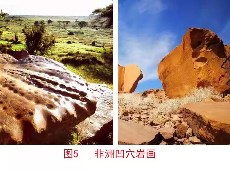 但值得我们深思的是,中国的凹穴形式为什么会与世界各地的凹穴形式如出一辙?例如在非洲发现的联排凹穴、阳角凹穴(见图5)与中国的联排凹穴、阳角凹穴基本相同;在美洲发现的散点凹穴(见图6)与中国散点凹穴完全一致,这种现象似乎佐证了人类起源于某一个部落的学说。目前,公认的人类起源说认为,今天世界上所有的人类均来自非洲的某一个部落。例如,在四川距今5000年至3000年的三星堆遗址就出土了与西亚金杖雷同的金杖及印度洋里的贝壳,说明史前人类迁徙跨度非常之大,并在迁徙中将凹穴文化传播到世界各地。
