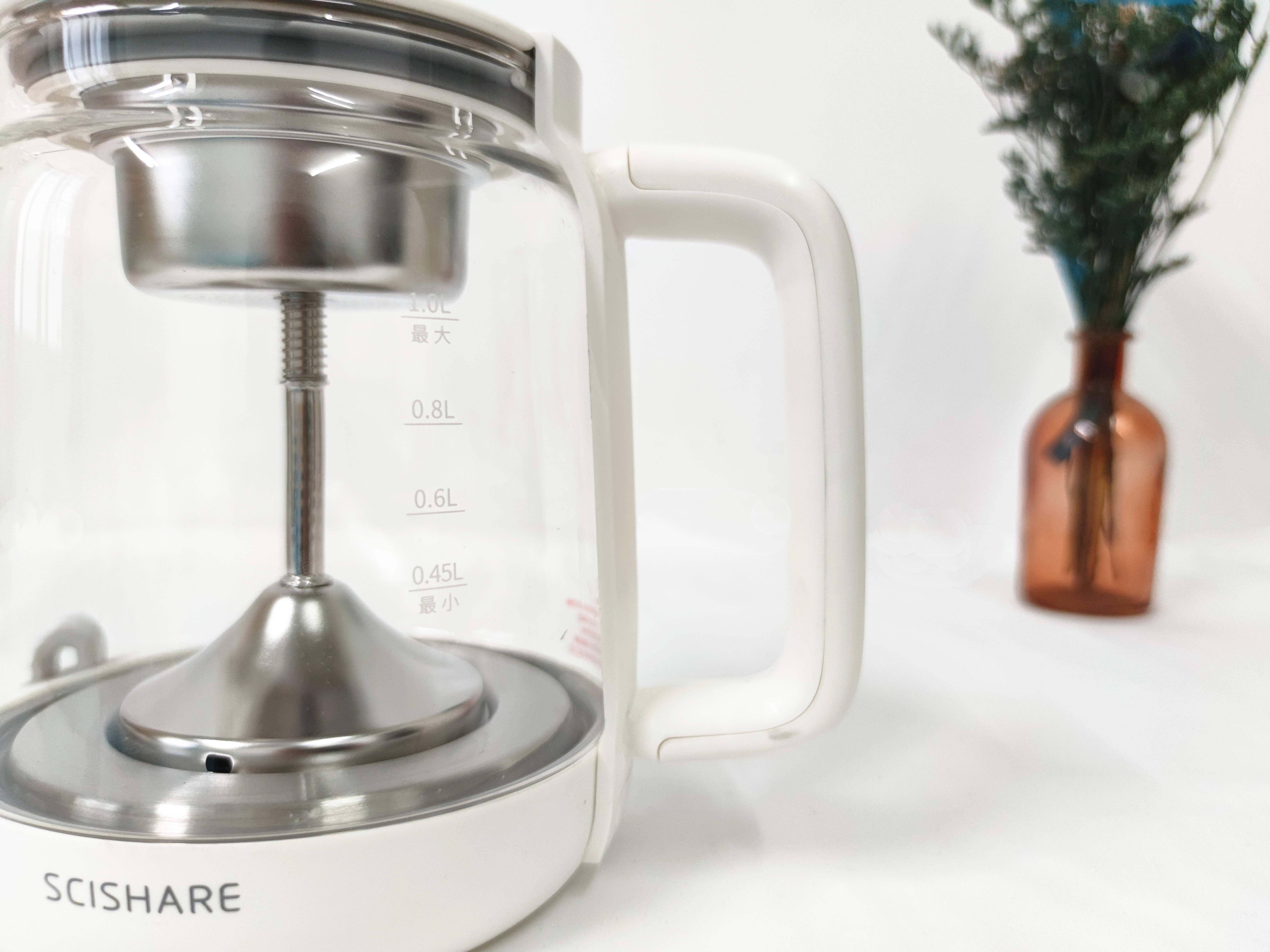 心想养生煮茶壶的尺寸为210*186*171mm,小巧的机身放在桌面上不会占用太多空间。壶身的刻度可以提醒当前的茶水容量,最高容量可以达到1.0L。当然煮茶的时候最少添加到0.45L,避免容量过小将水烧干。