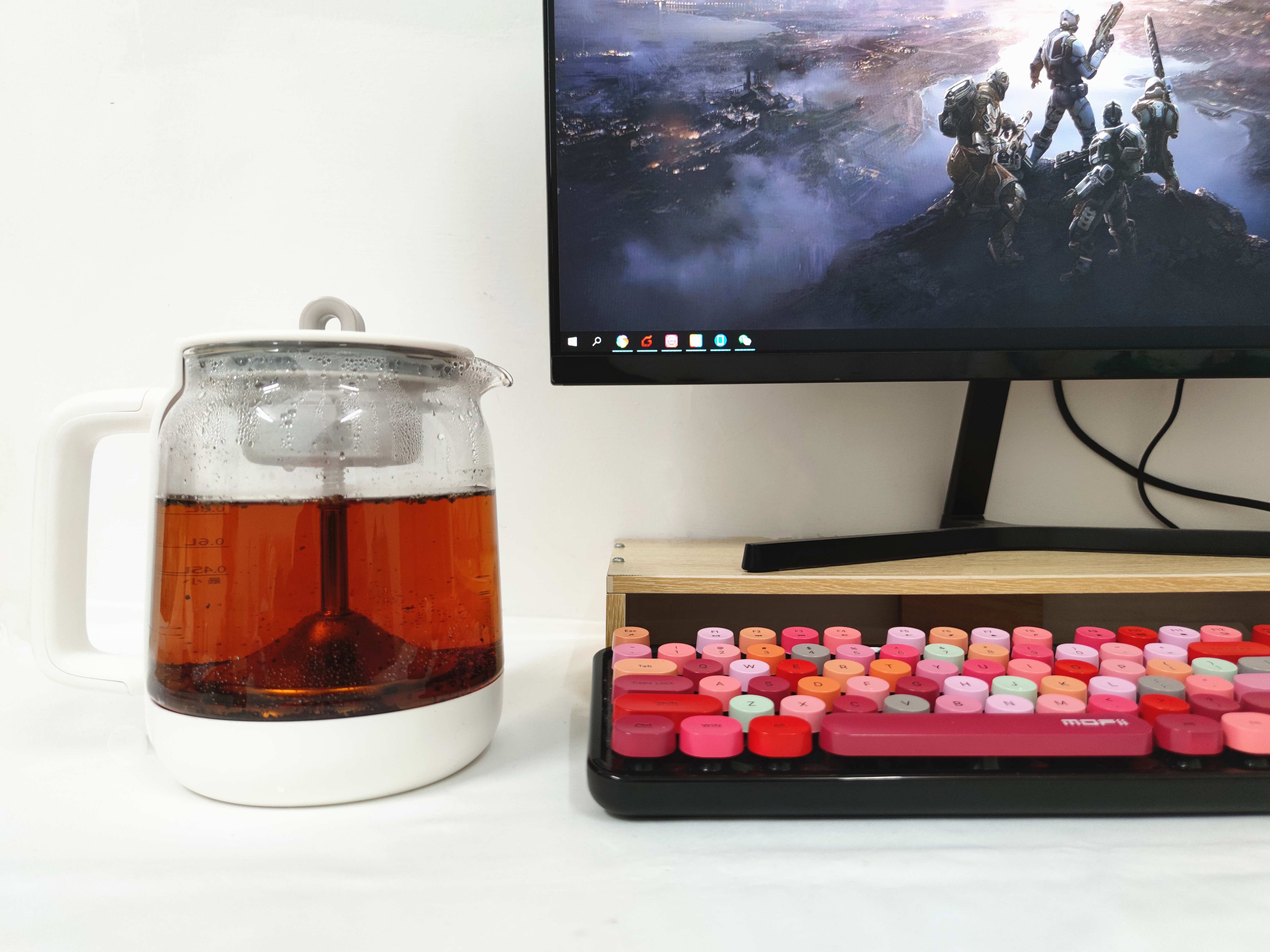 白色的手柄和底座,让茶壶看起来非常的简约。为了将茶泡出好味道,心想养生煮茶壶采用喷淋式蒸茶方法,通过高温对茶叶进行循环淋泡,将茶身充分唤醒。相比于冲泡方法来说。淋泡能够让茶变得更清香。