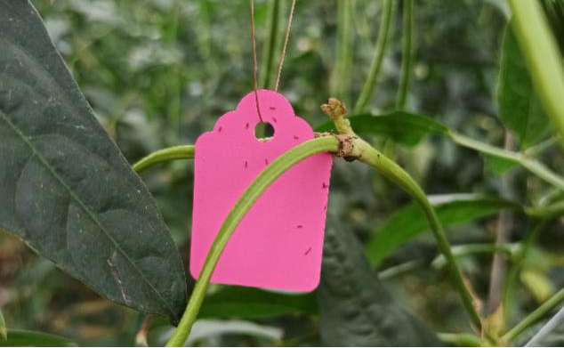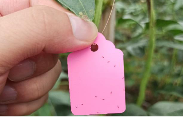 经田间观察发现,豆角花蓟马对粉色具有趋向性,在豆角周边悬挂粉色诱虫板,能有效诱杀蓟马,减缓蓟马的危害。