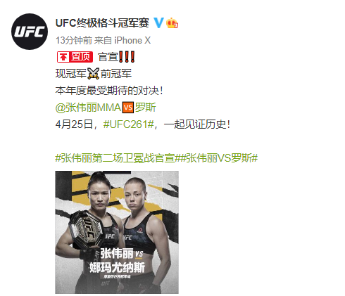 张伟丽将于北京时间4月25日在美国拉斯维加斯举办的UFC261期的比赛中打响自己的卫冕战,对手正是“玫瑰”罗斯。