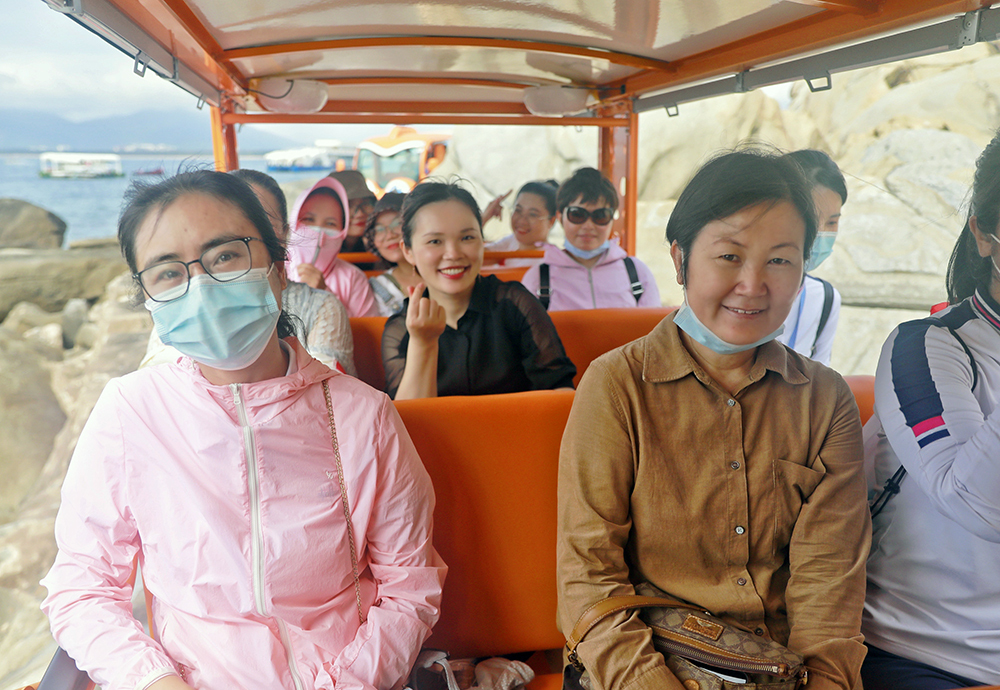 净滩结束后,“女神团”一行乘坐环岛电瓶车,对蜈支洲岛的娱乐项目、海洋保护和垃圾处理等方面称赞不已。