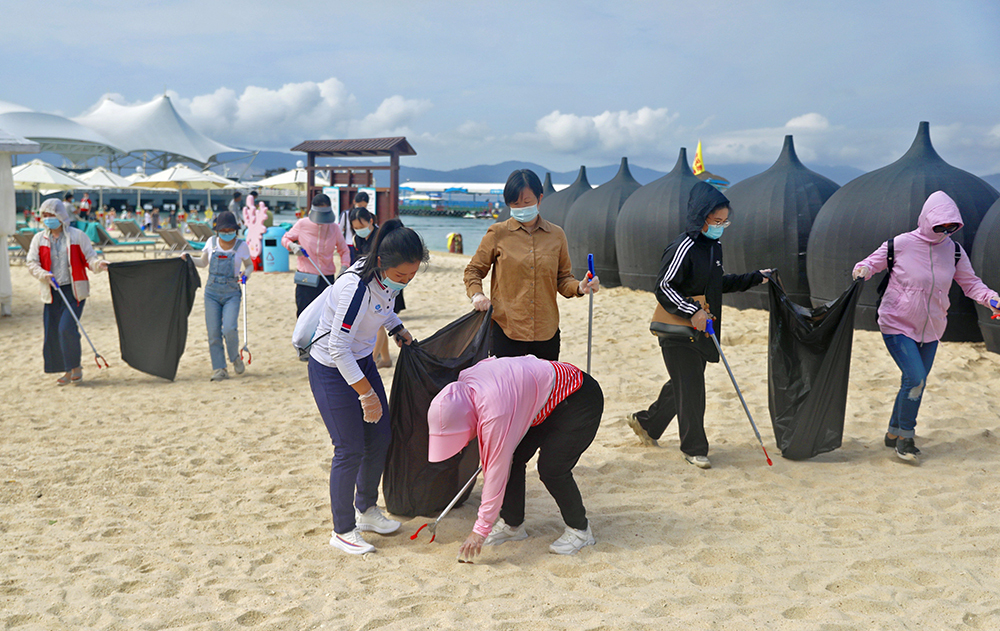 活动当天,“女神团”上岛后来到净滩区域,在领取工具后并沿着海岸线捡拾沙滩上丢弃的废弃物,并带动身边的人积极进行垃圾分类,大力倡导低碳生活,营造文明和谐的社会环境。