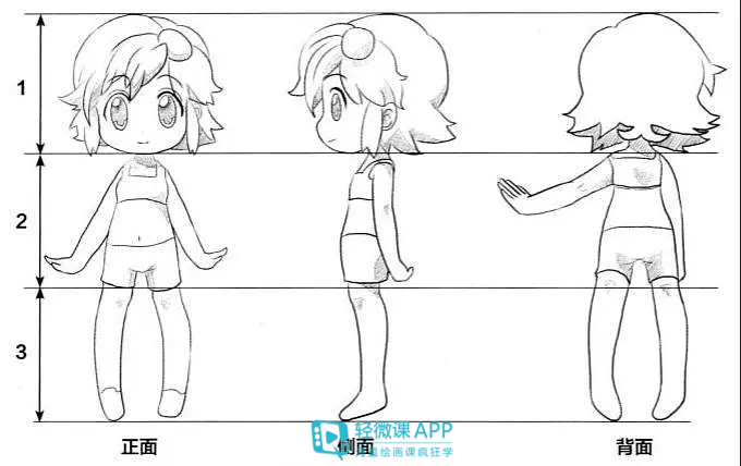 3头身Q版漫画人物的头部、躯干和腿部比例均衡,一般为1:1:1。这种头身一般用于表现少年Q版人物。3头身人物的身体平衡度最好,头部、躯干、腿的比例大约是1:1:1。腿部开始有变长的趋势。