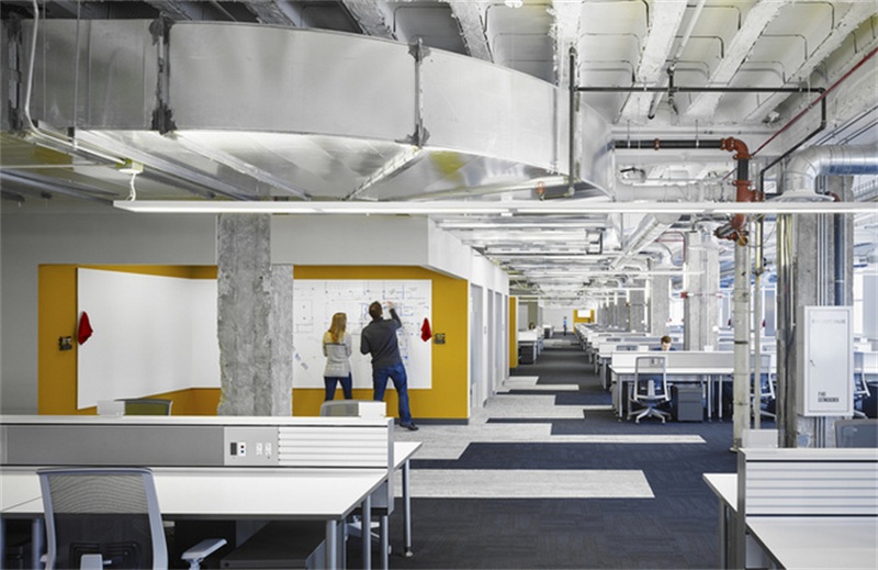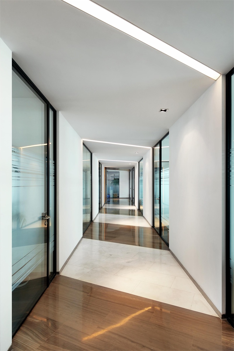 办公室走廊属于办公区间的过度,所以可以不妨在走廊的天花设计时多花心思,大家不要觉得这是一个没用的设计,通常注意好这个小细节往往就是成功的一大步。在设计天花时需要考虑到走廊的光线及亮度,一般采用吸顶灯设计,或者长方形的灯带,照明的亮度需要合理把握。并不一定越亮越好,当然也不是越暗越好,同时天花的设计要与整体风格一致!