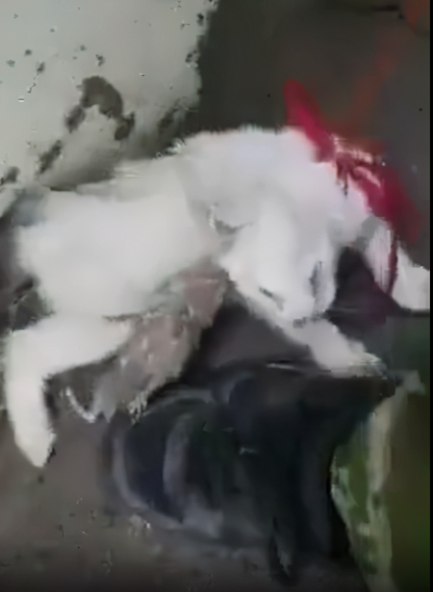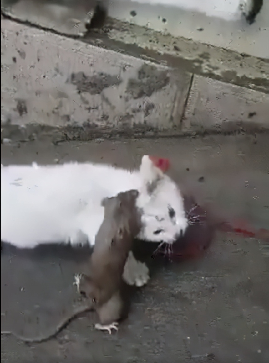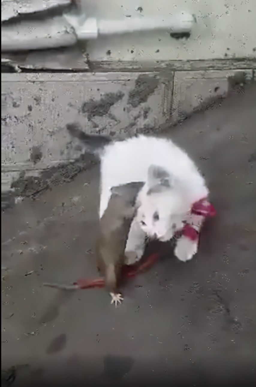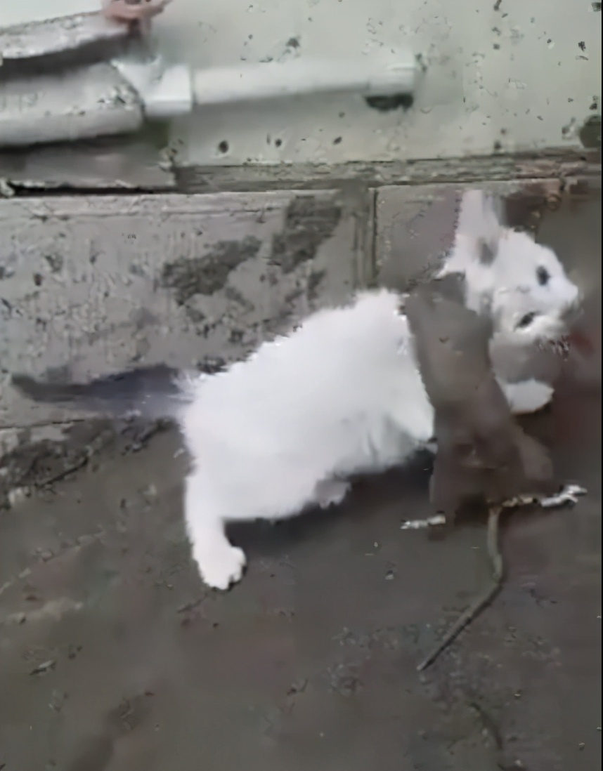 看这老鼠也努力着咬着,这只大老鼠体格比常见的老鼠大得很多,应该是老鼠爷爷辈的吧,最后没办法,主人只能帮助猫咪将老鼠赶跑!