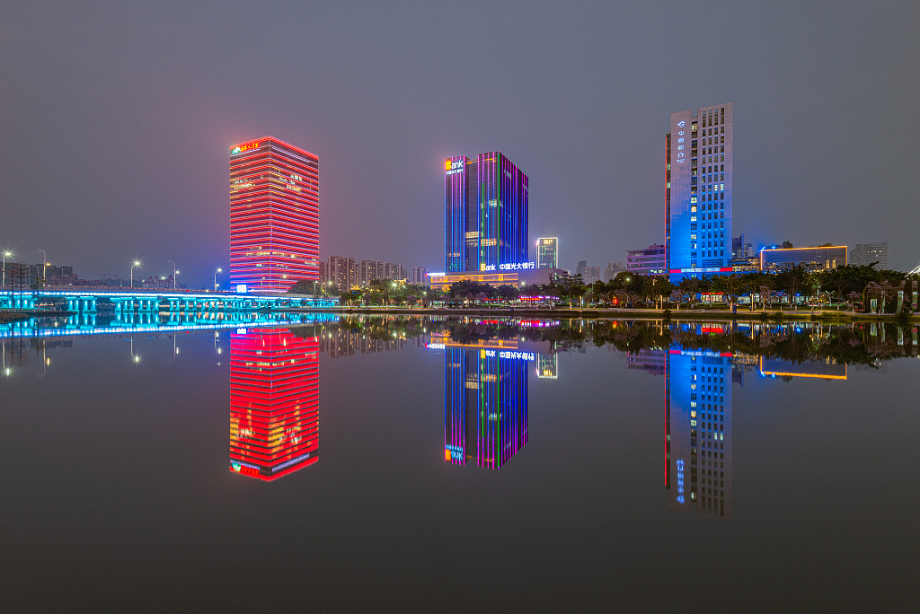 2021年3月9日,广州,南沙区黄阁镇蕉门河中心区域一带的城市建筑夜景迷人。(图片来源:视觉中国)
