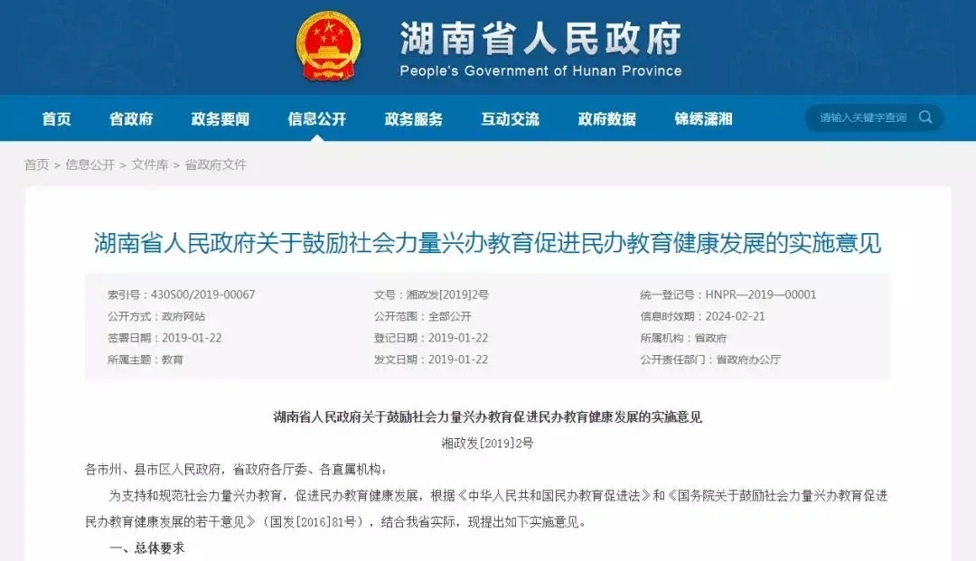2019年初,湖南湖南省人民政府官方网站发布《关于鼓励社会力量兴办教育促进民办教育健康发展的实施意见》。《意见》从总体要求、加强党对民办学校的领导、实行民办学校分类管理、完善扶持政策措施、规范民办学校管理、提高教育教学质量、提高管理服务水平等多方面对办学作了明确的细则要求,以此促进湖南地区民办教育健康发展。