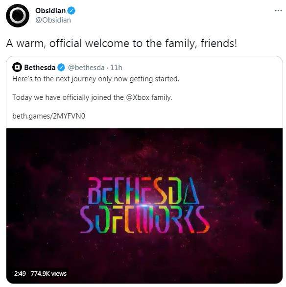 在昨晚微软发布公告称,欢迎Zenimax旗下Bethesda、Arkan、id Software等共八个工作室加入Xbox的大家庭。微软旗下的黑曜石工作室今天发布推特称:“恭喜你加入微软大家庭,我的朋友!”目前Zenimax的八个工作室已经合并成了一个团队,相信未来也会和黑曜石等团队碰撞出更多的火花。