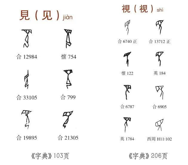 再如“见”和“视”,也是极为常见的字,书法篆刻家在写、刻甲骨文作品时经常将“见”误作“视”。如下图某篆刻家的作品: