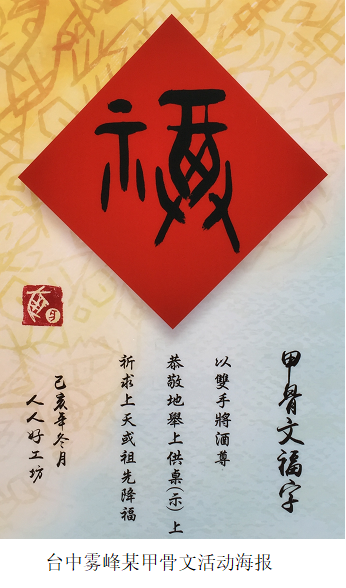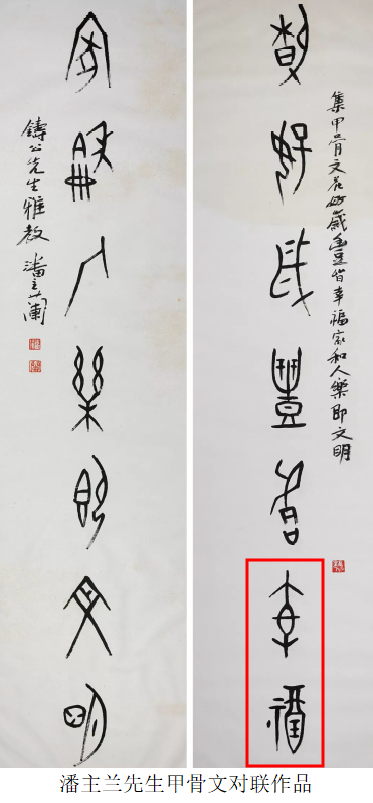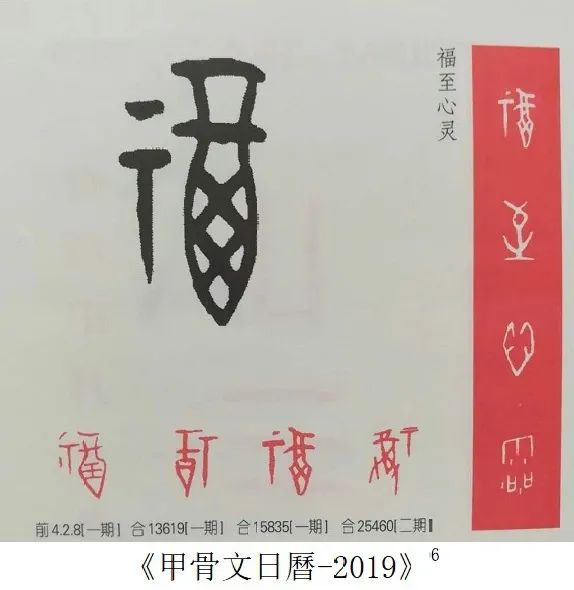 中华人民共和国成立以来,随着国家发展建设的步伐,各地各种极为宝贵的文物呈井喷式出土,正所谓“地不爱宝,山川呈瑞”,这其中当然也包括了甲骨文的不断新发现。随着这些新发现和旧有甲骨材料的著录和研究著作不断整理出版,如著名的《甲骨文合集》《小屯南地甲骨》和《殷墟花园庄东地甲骨》等书,极大地促进了甲骨学的发展,同时也为甲骨文书法创作提供了庞大的资料库,促使不少书法家以金文、石刻篆文等传统金石古文字为主要对象转身到甲骨文书法创作中来。与此同时,早期以古文字学家为创作主体的现象,也发生了很大的改变,当下甲骨文书法创作的主力军无疑是书法家,除个别专职书法家外,这些人在社会中往往职业、年龄各异,可见甲骨文及甲骨文书法的爱好实践者已经从个别专家走向社会大众。相信在可见的未来,社会上学习甲骨文、书写甲骨文的队伍必将不断壮大,甚至有可能形成一股热潮。这也反映在目前各大书法展赛中,甲骨文书法随处可见。但令人颇为遗憾的是,绝大多数展赛或书家个展的作品以及出版的甲骨文书法作品集中,书法本身水平姑且不论,仅就字法而言,很少不见错别字的作品。陈炜湛先生曾在《请正确书写古文字——向书法家进一言》中指出:“不少标明‘甲骨文’‘钟鼎文’‘大篆’的作品,连甲骨文专家、古文字学家也无法辨认,更休说一般的读者(观众)了。”5三十多年过去,这种现象在当前的各大书法展赛中,依然可见,令人堪忧。早期古文字书家或学者所写的作品固然也会出现一些错误,那是受当时文字研究、释读水平的制约,无可非议。当下如果依然写那些早已被学界纠正的错误字法,那在深感遗憾的同时也不得不令人思考其背后的原因。如20世纪书法家潘主兰先生所写的一幅甲骨文对联作品。潘先生书法水平甚高,也是我尊敬的前辈书家,但这件作品中,将“幸福”写作“㚔祼”。“㚔”字在隶楷书中亦写作“幸”,遂与幸福字同形。还有一些当下书法家所写或所编的出版物如:当代某篆刻家所刻甲骨文印中“福”字,实为“祼”字;《甲骨文日历-2019》将“福”字作“祼”。