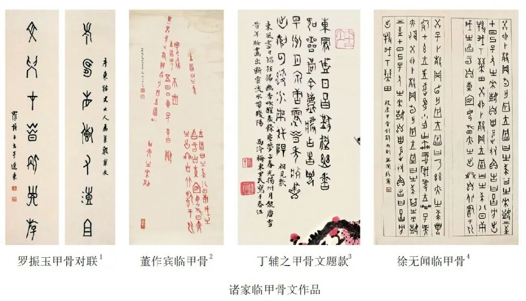 书法和文字有着天然的密切关系,甲骨文的发现自然为书法领域所关注,并成为创作取材的对象。由于材料的特殊,在甲骨文发现早期,能从事甲骨文书法创作的往往是那些身为古文字学家的研究者。其中罗振玉道夫先路,最早将甲骨文从艺术角度引入书法创作之中,他还编写了《集殷墟文字楹帖》一书,这对推动和普及甲骨文书法创作起到很大的作用,其后董作宾、马衡、容庚、商承祚等先生继之。由于古文字学家的整理研究并参与书法实践,其风气也逐渐影响到书法界,如王福庵、丁辅之、胡小石、徐无闻、潘主兰等先生,皆擅此道。