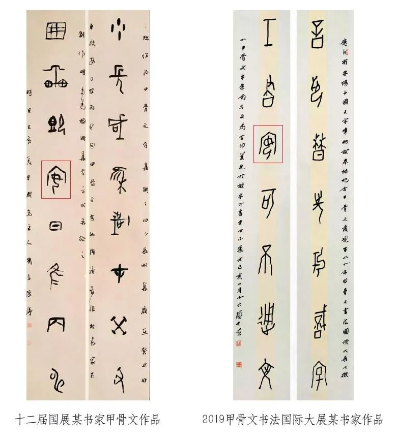 最近几十年来,甲骨文资料的考释、著录、整理、释读、研究等工作有序推进,甲骨文学界成果累累,人才辈出,书法家也应该见贤思齐,勇猛精进。以甲骨文为载体从事书法创作,首先就是要保证字法的正确,遵循并合乎文字本身的构形规律和造字理据,在此基础上利用精深的笔墨技巧进行艺术手法的加工和创造,展现书家个人的才情,只有这样,写出来的作品才兼顾学术性和艺术性。
