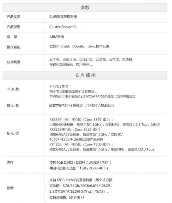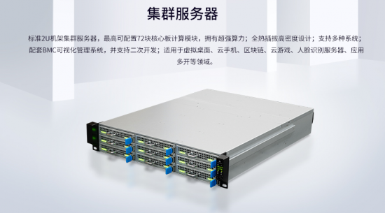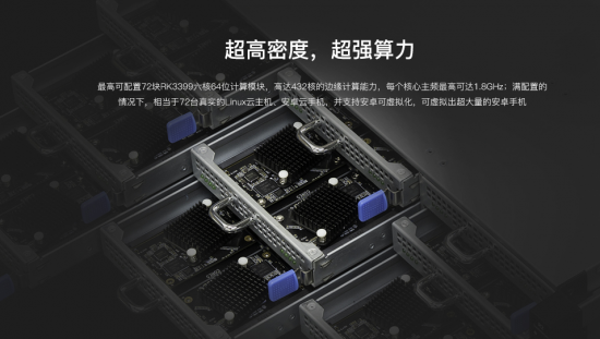 点动云D720超高密度,超强算力集群。最高可配置72块RK3399六核64位计算模块,相当于72台真实的安卓云手机、Linux云主机,拥有432核高达1.8GHz主频的边缘计算能力,支持安卓可虚拟化。亦可配带NPU的AI加速计算模块(单片算力高达2.8Tops),组合成超高算力的AI集群服务器