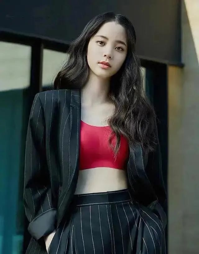 欧阳娜娜更像是在给外搭的黑色条纹西装代言;