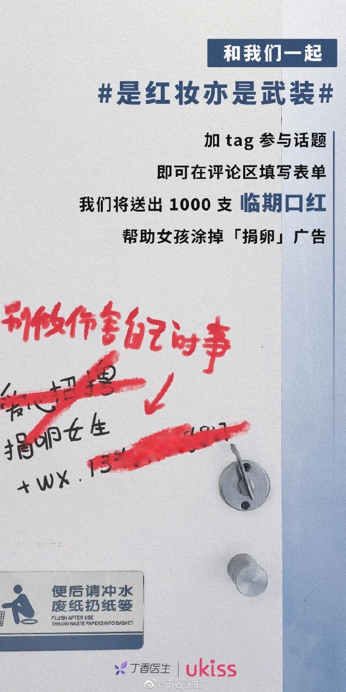 除了科普以外,丁香医生还将关怀落实到行动上,联合美妆品牌Ukiss共同发起用口红涂掉捐卵广告计划,向读者送出 1000支临期口红,号召拿到口红的读者随身涂掉捐卵广告,凝聚起每一份微小力量,帮助更多的迷茫女孩免入歧路。