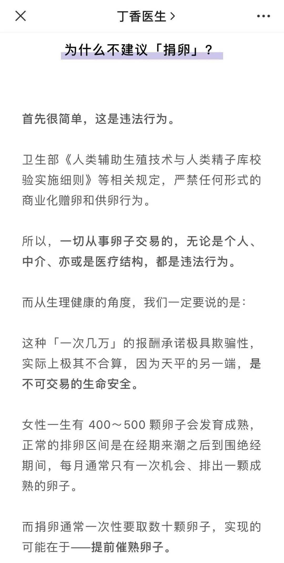 针对这一危害女性健康的现象,丁香医生发挥品牌的医学知识优势,以“专骗年轻女性的「赌命交易」,希望永远不要发生在你身上”为题,用医学生理知识向广大女性科普捐卵的危害,呼唤女性勇敢向捐卵行为说“不”。