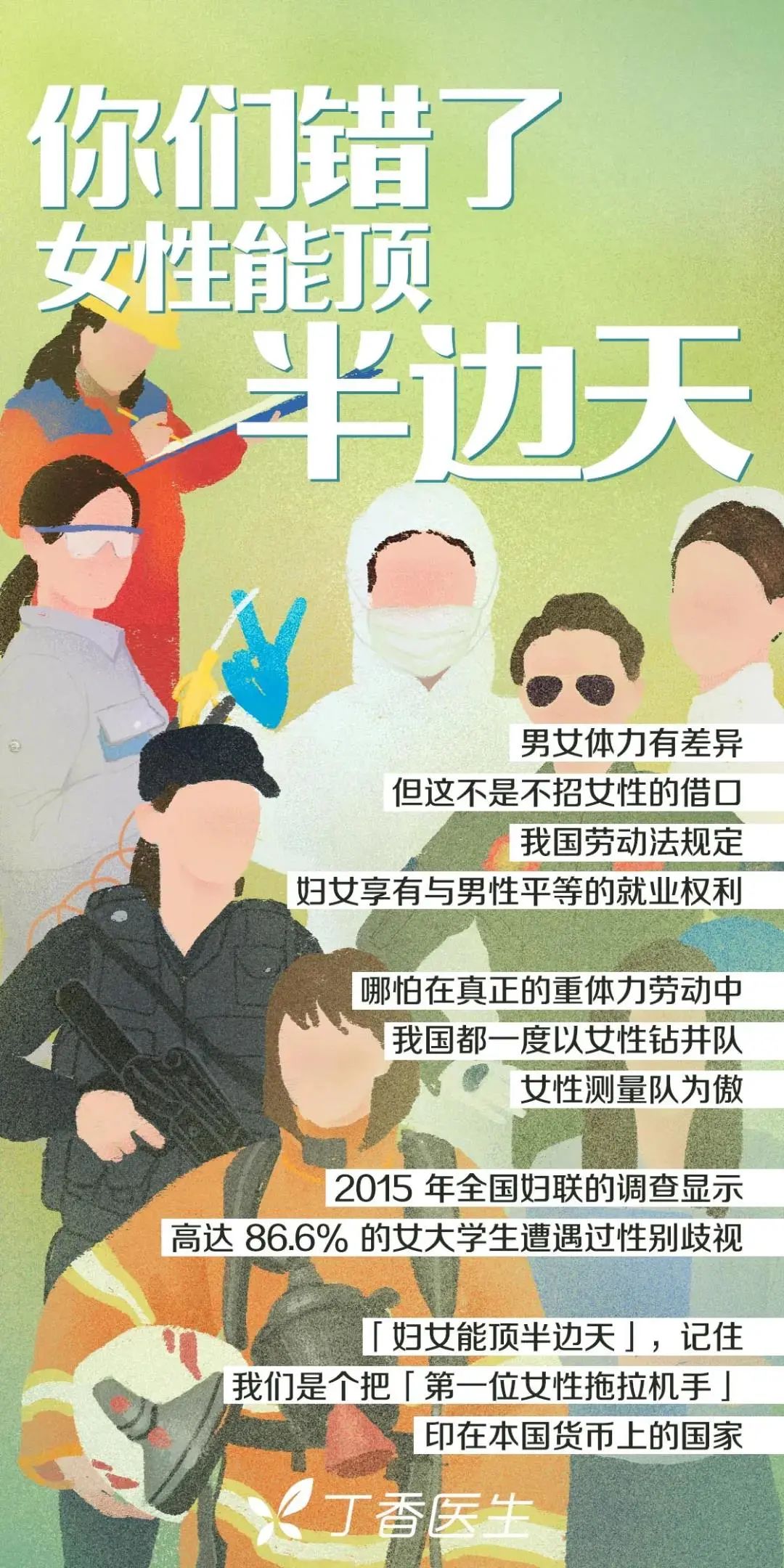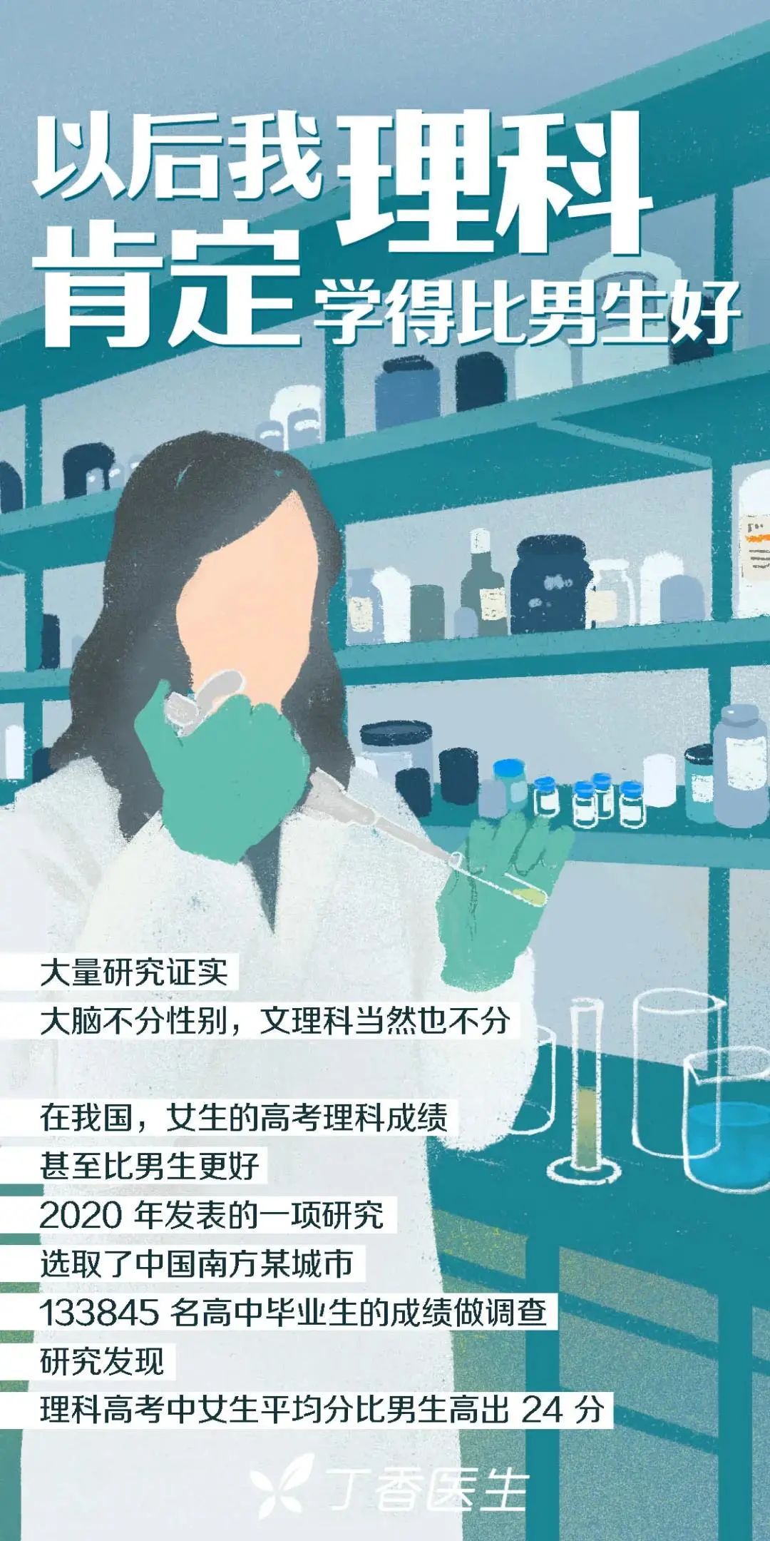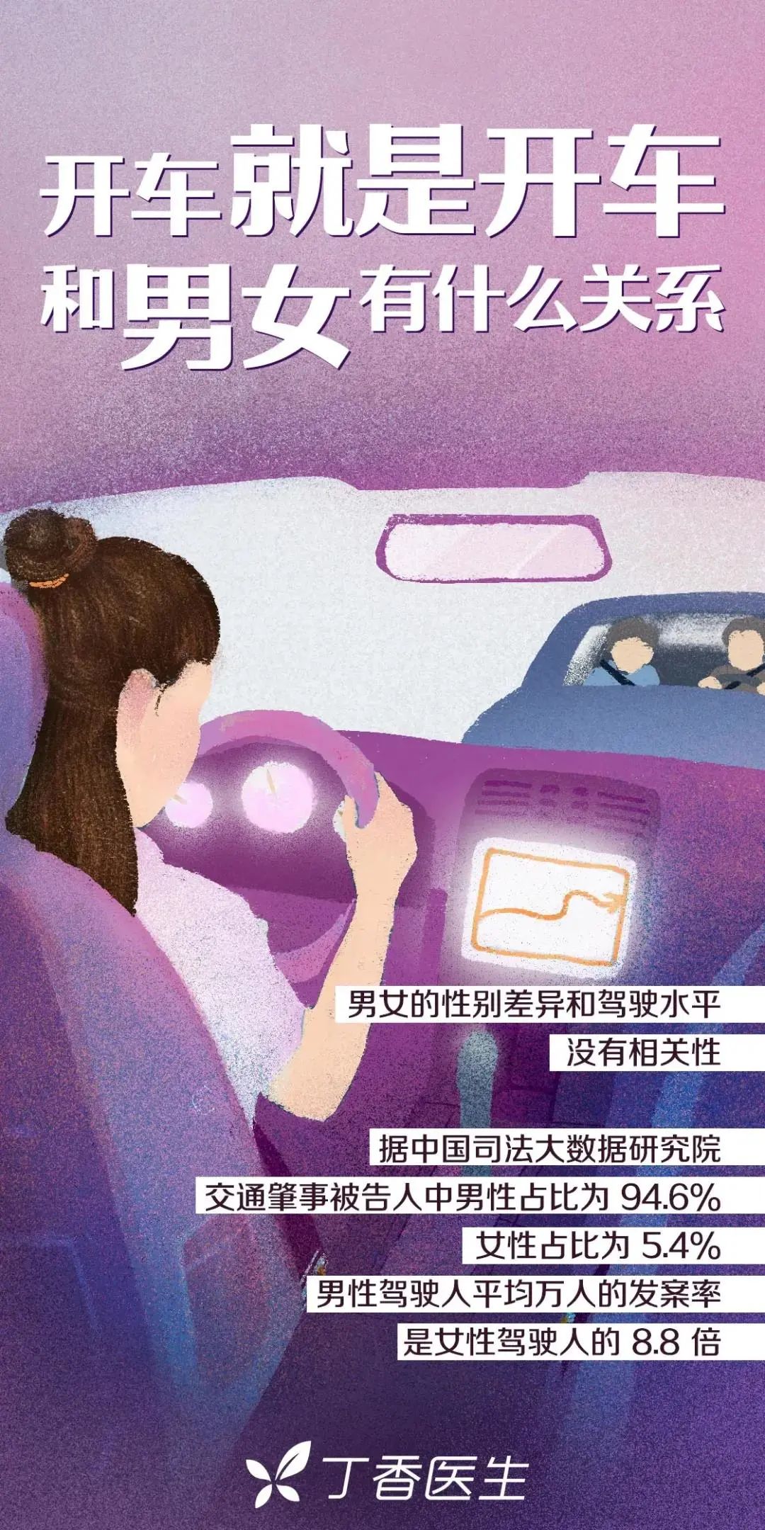 “2020年南方某城市的133845名高中毕业生调查,理科高考中女生平均分比男生高出24分”、“据中国司法大数据研究院显示,男性驾驶人平均万人的发案率是女驾驶员的8.8倍”、“男主外女主内不仅是女性的枷锁,也是男性的”,丁香医生一系列科学的数据有效地驳斥了社会上对女性的偏见。