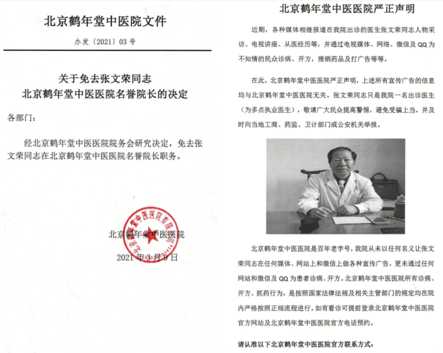 不过,北京鹤年堂中医医院在3月9日发布声明,将自身与院内出诊医生张文荣的个人行为做了严格区分。
