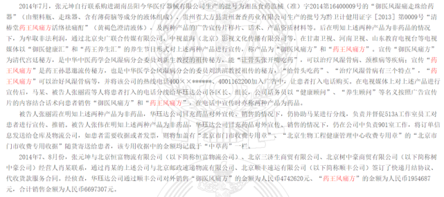 2014年,华珏达购进“御医风湿痛走珠给药器”、“清椿堂药王风痛方活络祛痛酊”两种产品,后在明知这两种产品为非药品的情况下,通过北京央广联合传媒有限公司、中视蓝海(北京)影视文化传播有限公司等,在甘肃卫视、河南卫视、山东教育电视台等电视媒体以“御医健康汇”和“药王养生汇”养生节目形式对上述两种产品进行宣传,称产品为“御医风痛方”和“药王风痛方”。
