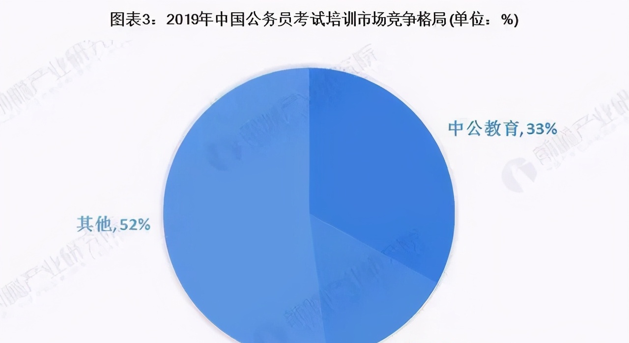 截至2019年, 中公教育以33%的份额位居第一,几乎是第二位华图教育的两倍。