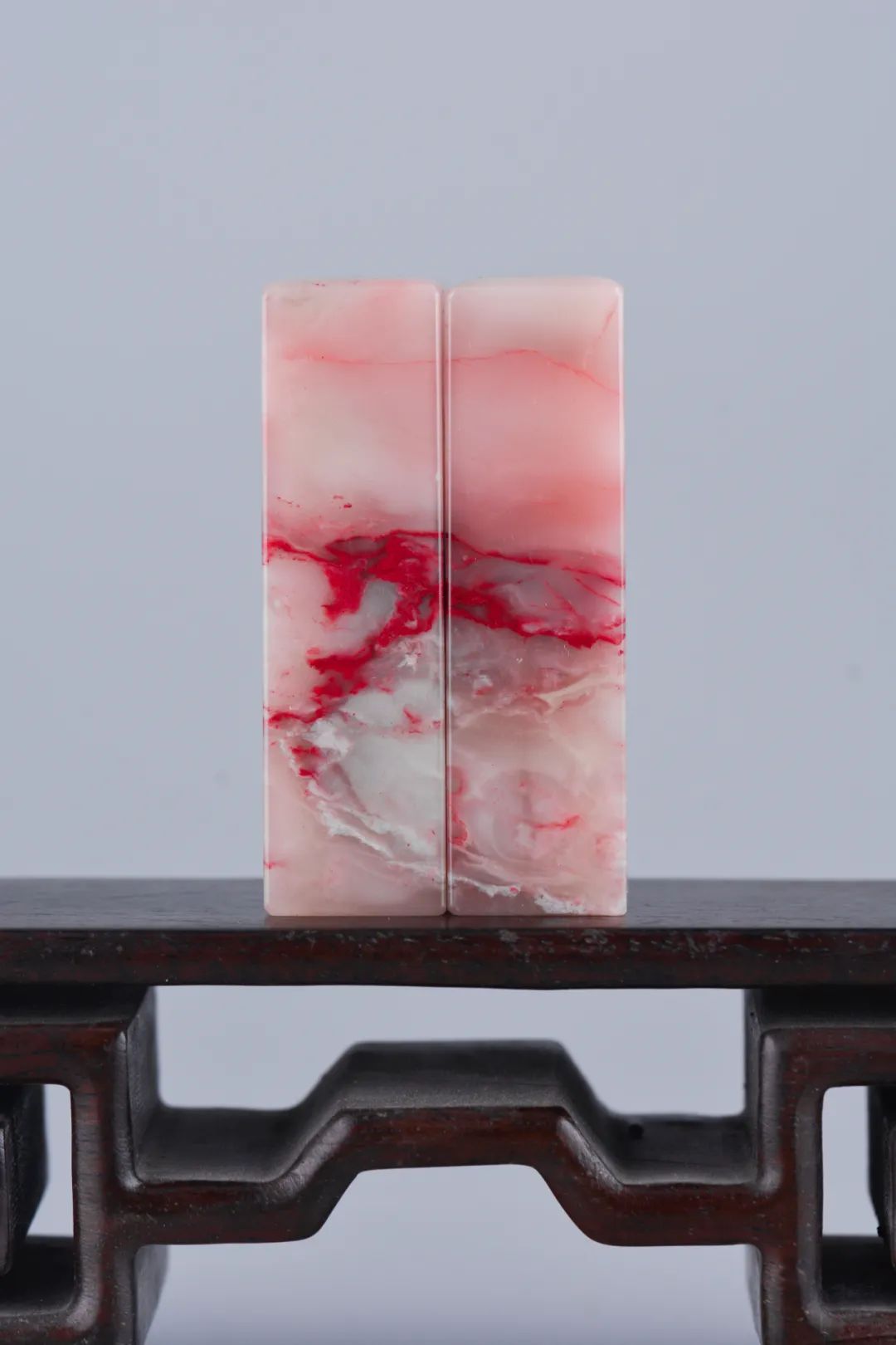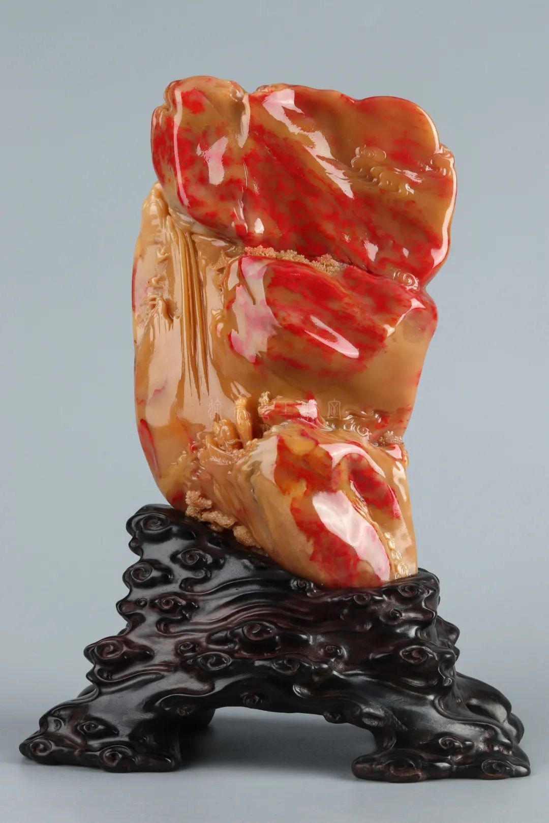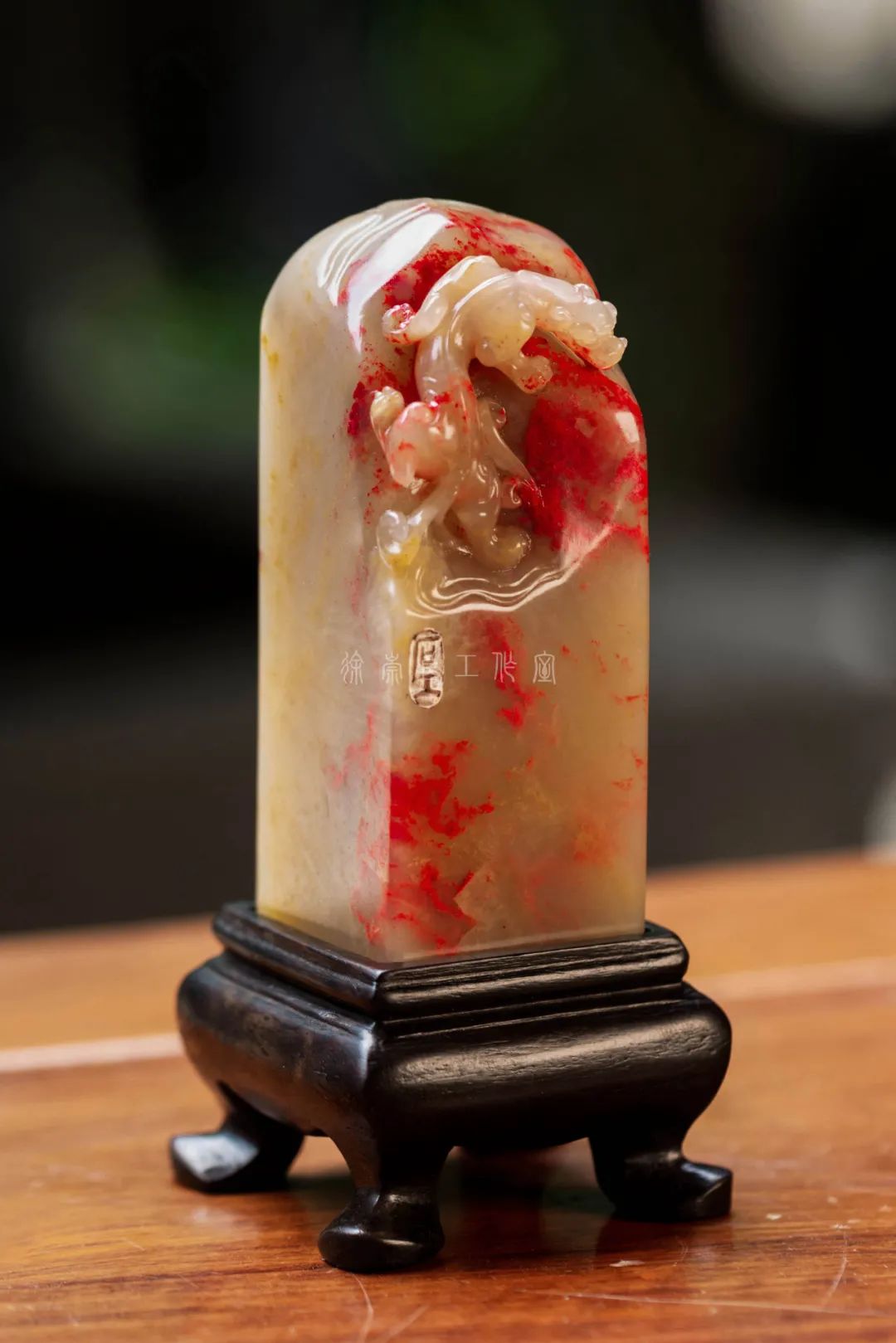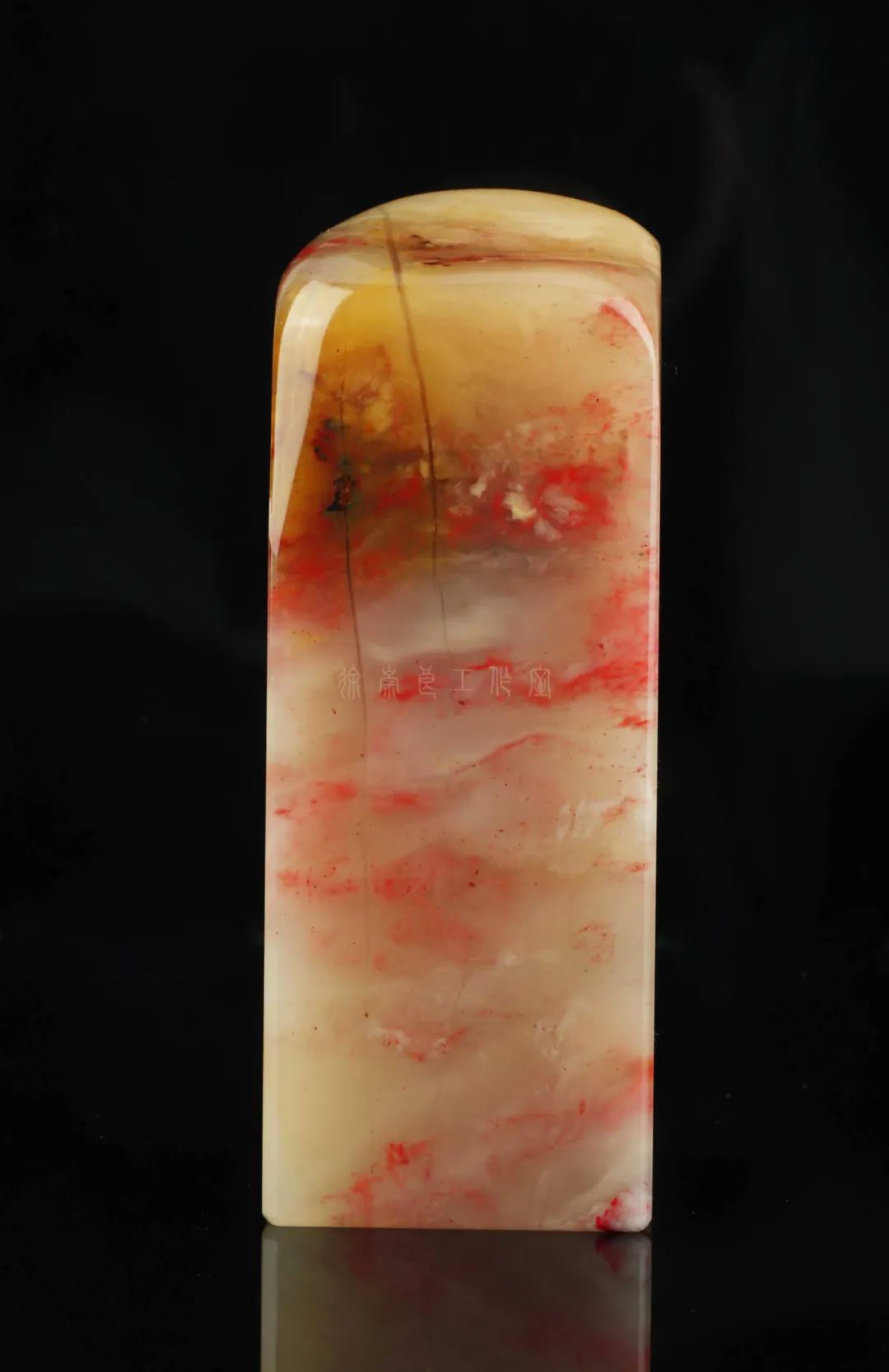 巴林石中的鸡血石多种多样,带有绮丽色彩的田黄鸡血石就是一种漂亮印石,它血色鲜红,底子呈黄色,虽无萝卜纹,但有多种美丽石纹,而且十分调和,这些印石品种、产量均稀少,所以倍觉珍贵。