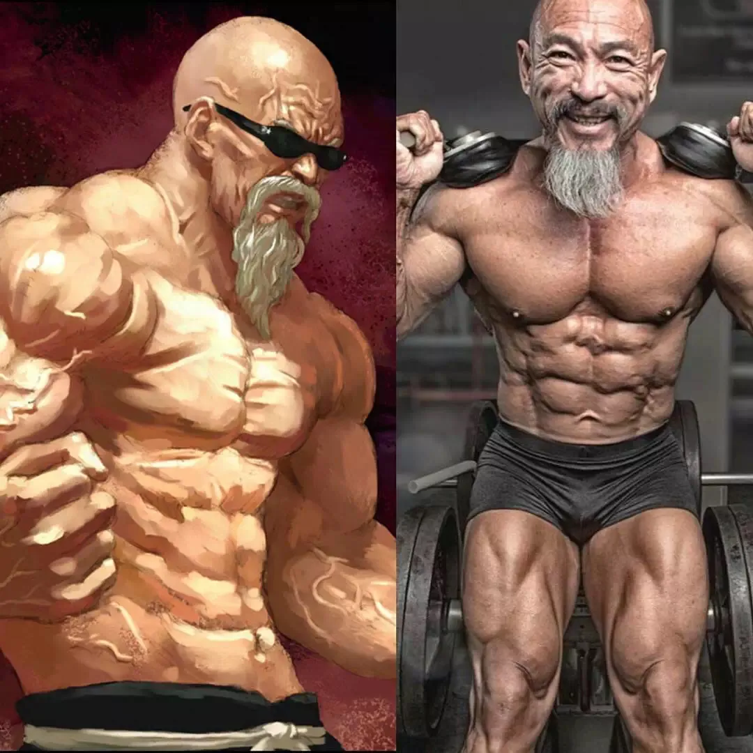 他有着和龟仙人一般的光头,再加上无比紧实凶猛的肌肉,配上长长的白胡子,也难怪网友们都觉得他就是从漫画中走出来的“龟仙人”,这简直太像了。