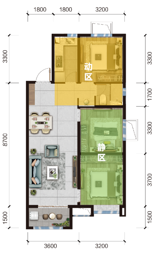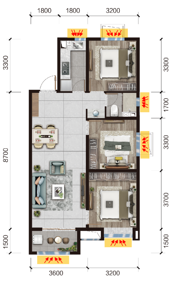生活方式是决定健康与否的重要因素,居住健康则是重中之重。建面约105㎡户型室内空气流通效果更好,通过空间与风、光的关系,尽可能地平衡室内外的温度差,从而让室内温度与人的体感温度实现更适宜居住的效果。