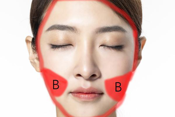 要想打好高光,阴影必须先行。无论是新手还是老手,都要遵循“少量多次”的原则。首先用阴影刷取少量的阴影粉,从发际线开始,自上而下沿着发际线轻轻刷一次,下巴位置沿着骨头的位置斜着刷下去,记得一定要轻轻地扫脸颊两侧(如下图中的B区所示),如果下手太重会让妆面看上去有“赃感”。