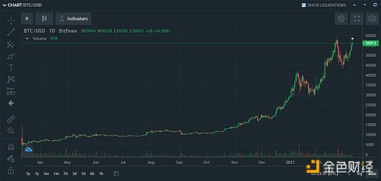 但截至2021年3月11日12:50,比特币价格达到55700美元。一年内上涨近14倍。