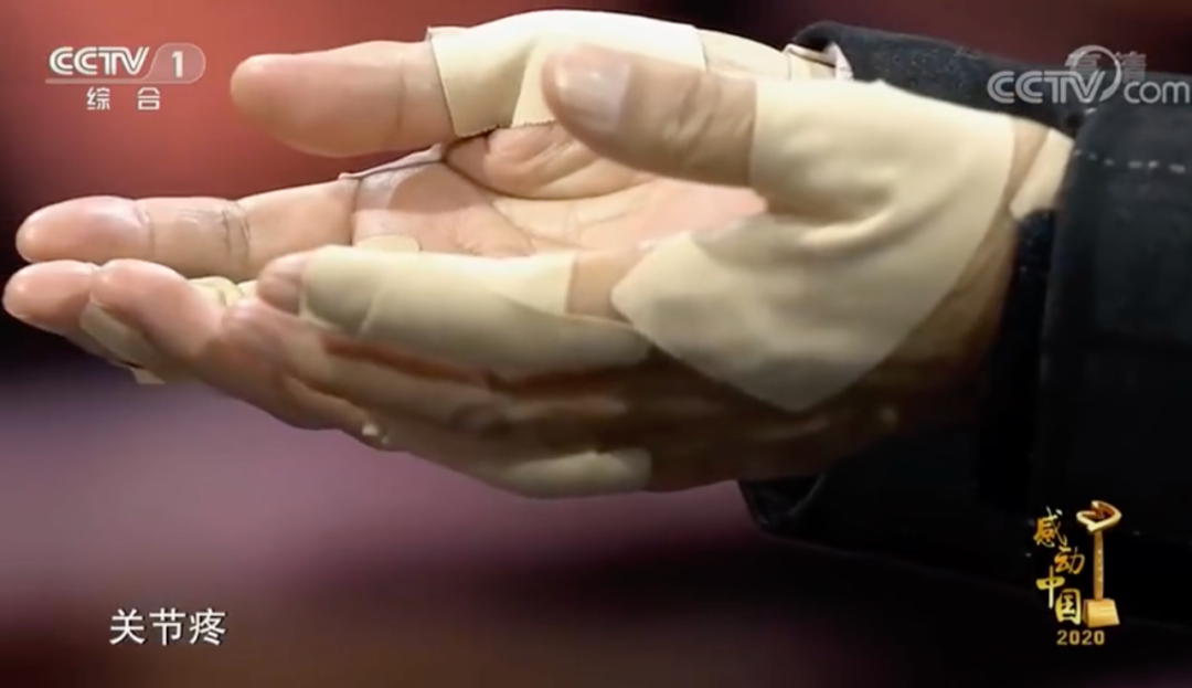 主持人白岩松问为何要贴胶布,她说:“关节疼,不贴手就伸不开了。”