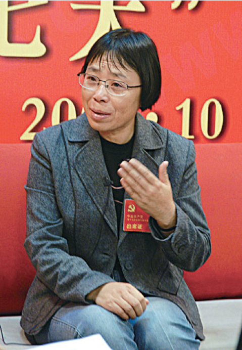 会议上,穿着破牛仔裤的张桂梅引起了记者注意。