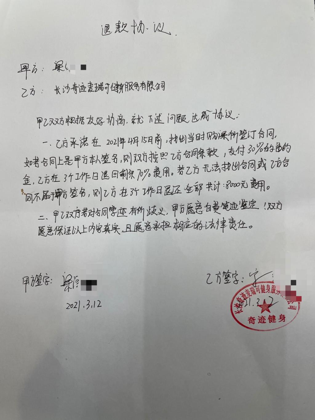 宁先生提出的方案得到了梁先生的认可,梁先生根据现场提出的方案手写了一份退款协议。除此之外,协议中还提到 " 双方若对合同字迹有所歧义,甲方(梁先生)愿自费笔迹鉴定 "。随后,双方在退费协议上分别签了名,并盖上了奇迹华坤店的公章。