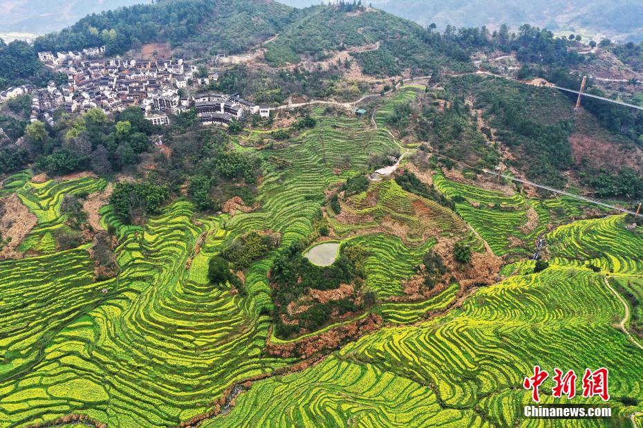 3月13日,随着气温回暖,位于“中国最美乡村”江西省上饶市婺源县篁岭景区的近万亩梯田油菜花陆续进入最佳观赏期。放眼望去,金灿灿的油菜花铺满梯田,犹如一片金色的海洋,蔚为壮观。如链似带的田野、层层叠叠的油菜花与徽派古村落构成一幅美丽的乡村春色图。 刘占昆 摄