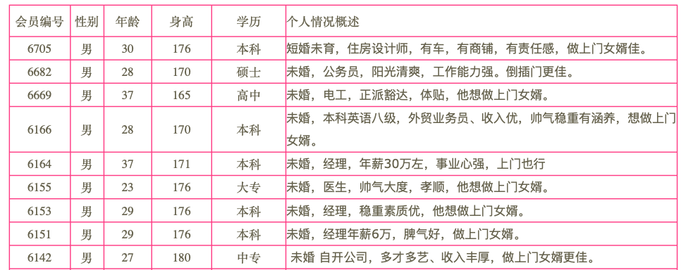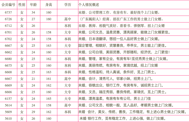 时代周报记者查询该婚介公司网站发现,在“入赘资源库”里,男方年龄24至37岁不等,从中专到硕士,有开网吧当电工的,也有当公务员、医生老师的。但总体信息相对较少,只有43条。