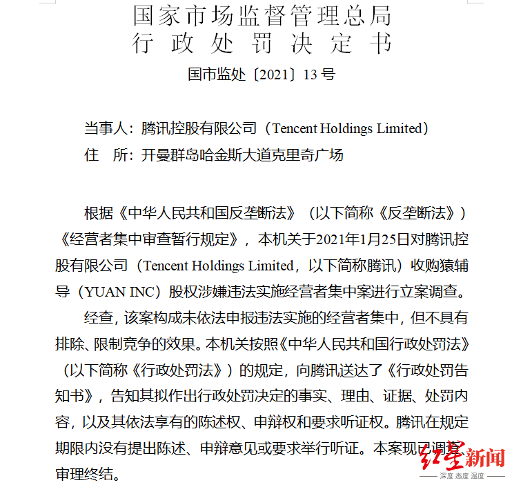 其中,2018年11月,腾讯与猿辅导签订F轮股权认购协议的形式,认购该轮融资发行股份的83.33%,取得了对猿辅导的控制权,随后在2018年11月29日,猿辅导完成了股权变更登记。通报显示,在此之前,这起收购未向市场监管总局申报,构成了未依法申报违法实施的经营者集中。此外在2017年,腾讯全球营业额及中国境内营业额、猿辅导全球和中国境内营业额都达到《国务院关于经营者集中申报标准的规定》第三条规定的申报标准,属于应当申报的情形,但未主动申报。