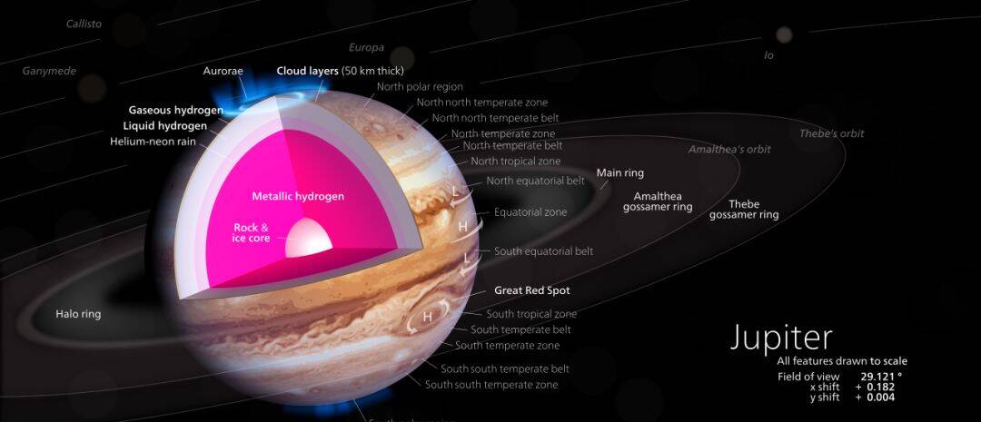 科学家们了解到,在木星云层下约3000公里处,压力是如此之高以至于电子可以从氢和氦分子中脱离出来,开始自由移动,产生了电场和磁场。