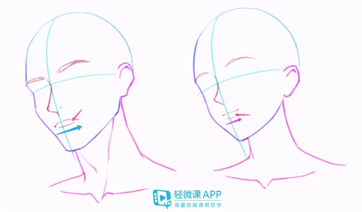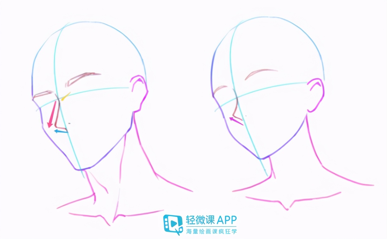 5、画鼻子时,男生挺、直、长,而且像这里的蓝色箭头跟红色箭头,女生会更“翘”一些。
