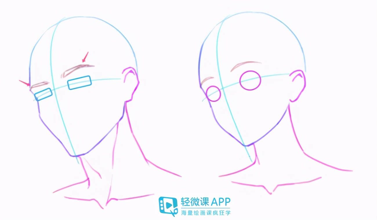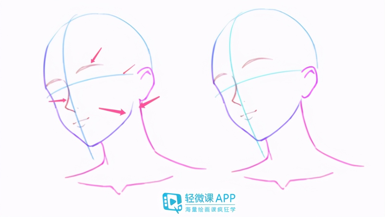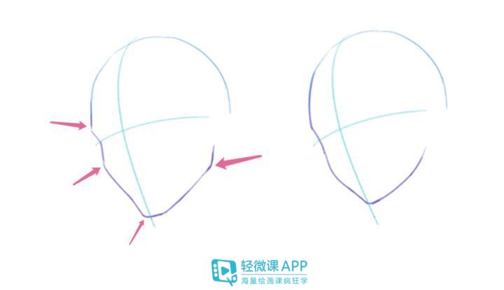 1、第一个不同的就是脸部的轮廓,主要去注意眉弓骨、颧骨、下巴、下颌骨,这四个骨点,要方一点。另外像是漫画画颧骨的时候可能不会太多刻画,但只是相反女生则是突出苹果肌的弧线/圆形:
