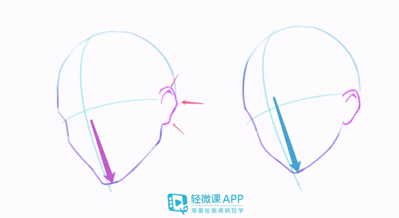 2、耳朵的画,也是男生比较突出这3个转折,女生就比较连贯、柔软。而且男生的脸形通常会稍长一些,所以十字线女也会偏下一点。