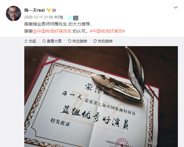 海一天在饰演“许大茂”后,似乎坚定了戏路,曾放话称,自己的目标是“国内第一反派”,近几年的事业也是专注在各类反派的诠释中。2020年12月,他凭借精湛的演技,拿到了电视剧好演员的荣誉。