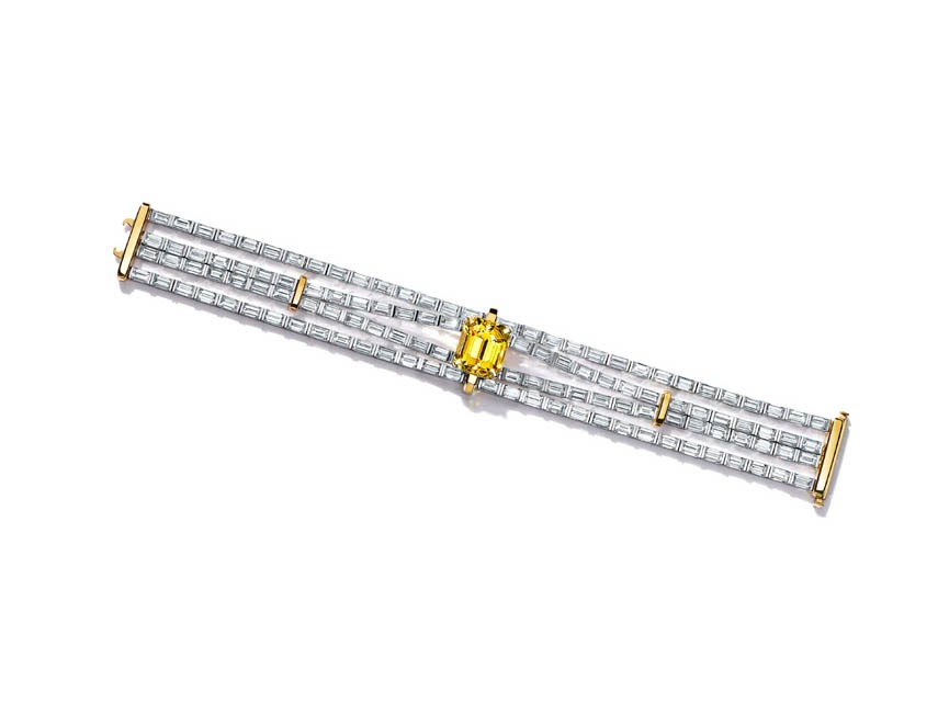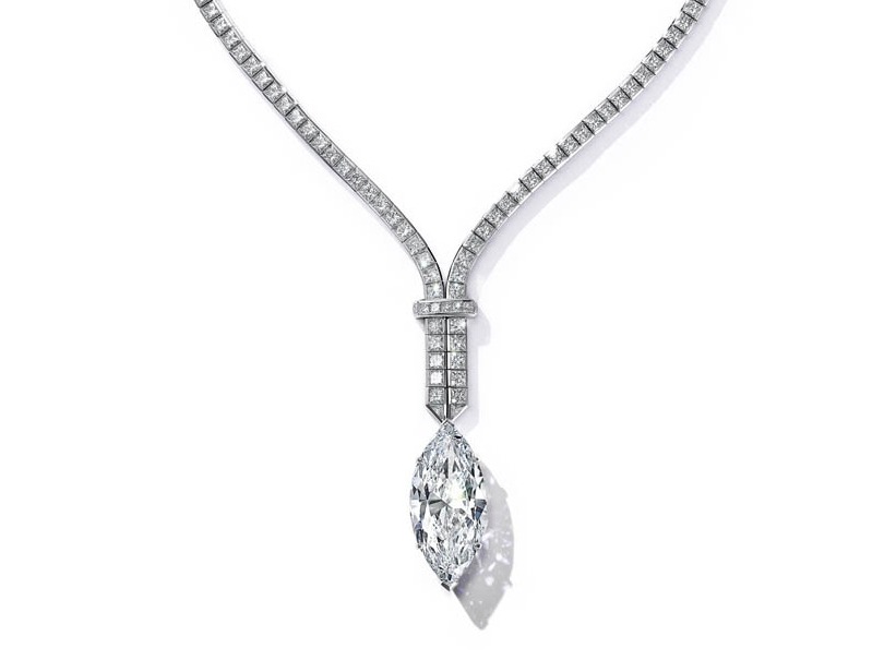 另外值得注意的是一条华丽的钻石项链。主要宝石是稀有的21克拉IF级侯爵夫人钻石。毛坯石是从非洲莱索托王国开采的。它在以色列进行了切割和抛光,并闪闪发光。整个主石配以流线型长链,具有简约现代的风格。