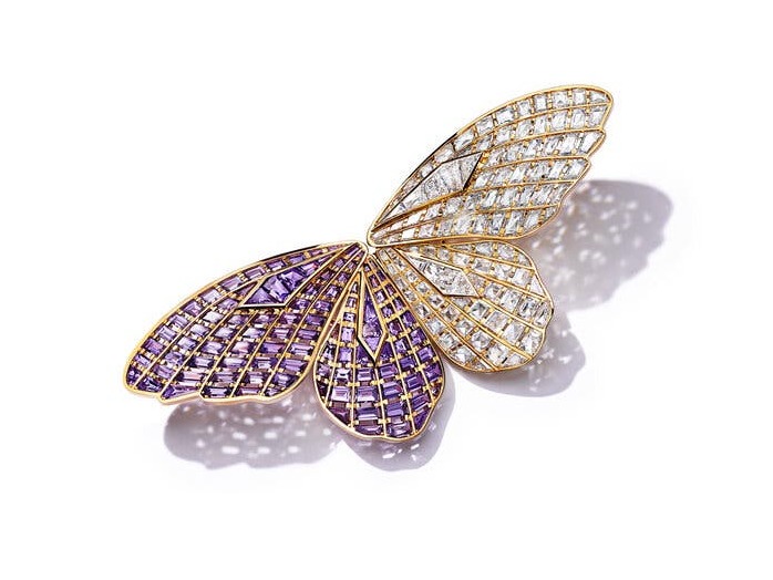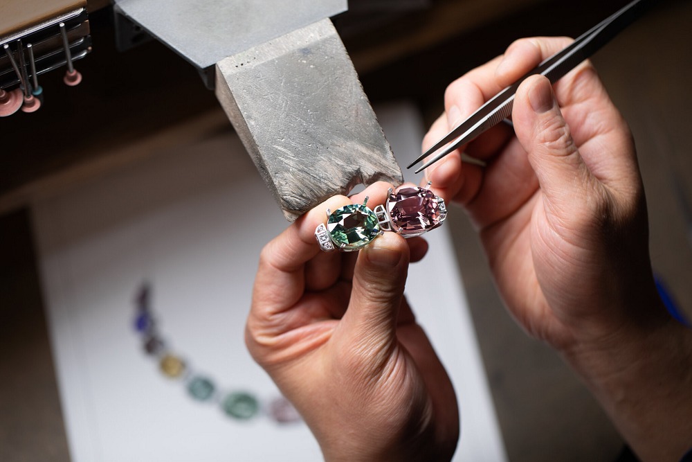 这项新作品以各种样式诠释了彩色宝石的魅力-单中心石戒指与铜锂电气石,黑蛋白石,紫星蓝宝石和其他彩色宝石搭配。颜色鲜艳夺目;胸针作品上镶嵌有定制的彩色宝石。例如,色彩艳丽的蝴蝶翅膀上缀有紫色蓝宝石和钻石。最鲜艳的是一条镶有19件大型多彩宝藏的项链。主石的总重量接近280ct。花了一年的时间才完成收集。