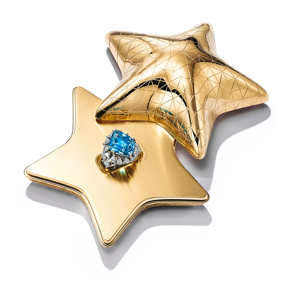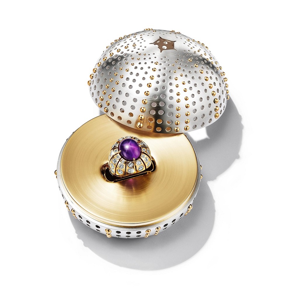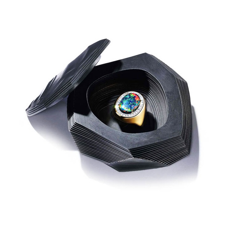 该系列总共有8件与定制设计的珠宝盒相配,使用金,银和水晶打造出独特的形状-紫星蓝宝石戒指放置在海胆形状的珠宝盒中; 11ct的铜锂碧玺戒指衬有与之匹配的海星形珠宝盒;黑色蛋白石戒指衬有磨砂黑色珠宝盒,这使得绚丽的自然色彩更加显眼。