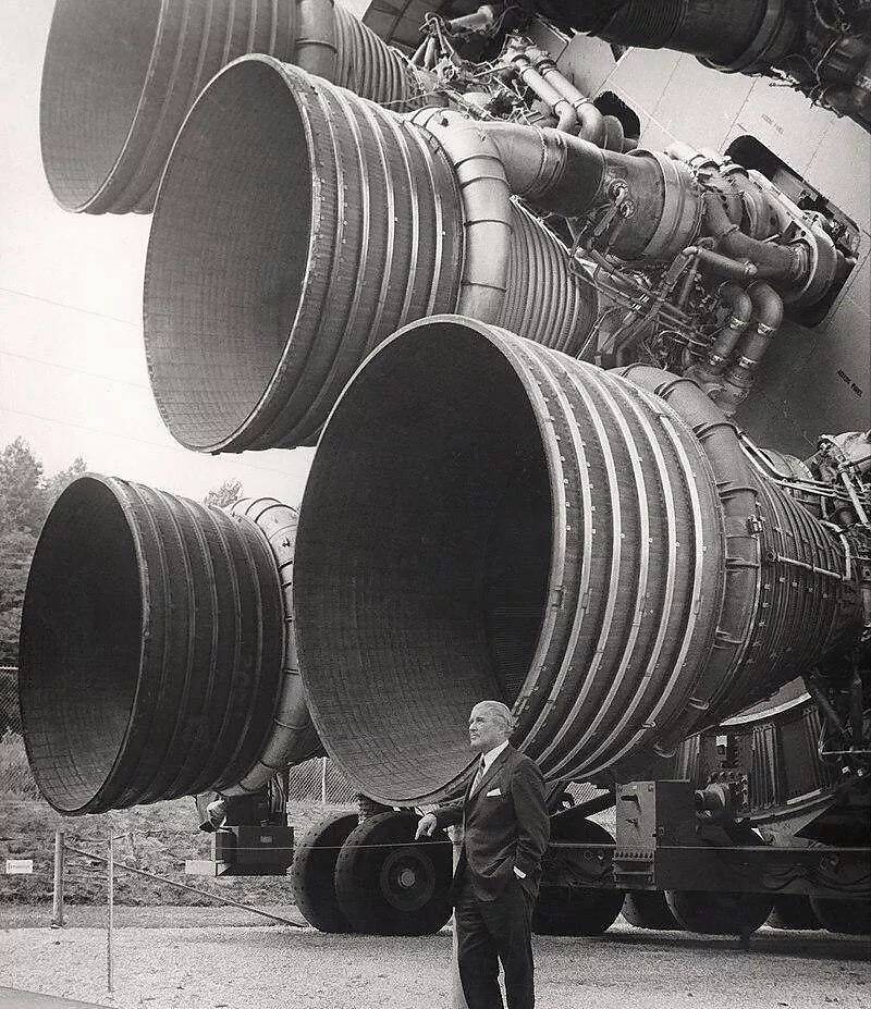 图解:冯·布劳恩在美国太空和火箭中心与土星5号动态测试火箭第一级所用的F-1火箭发动机合影