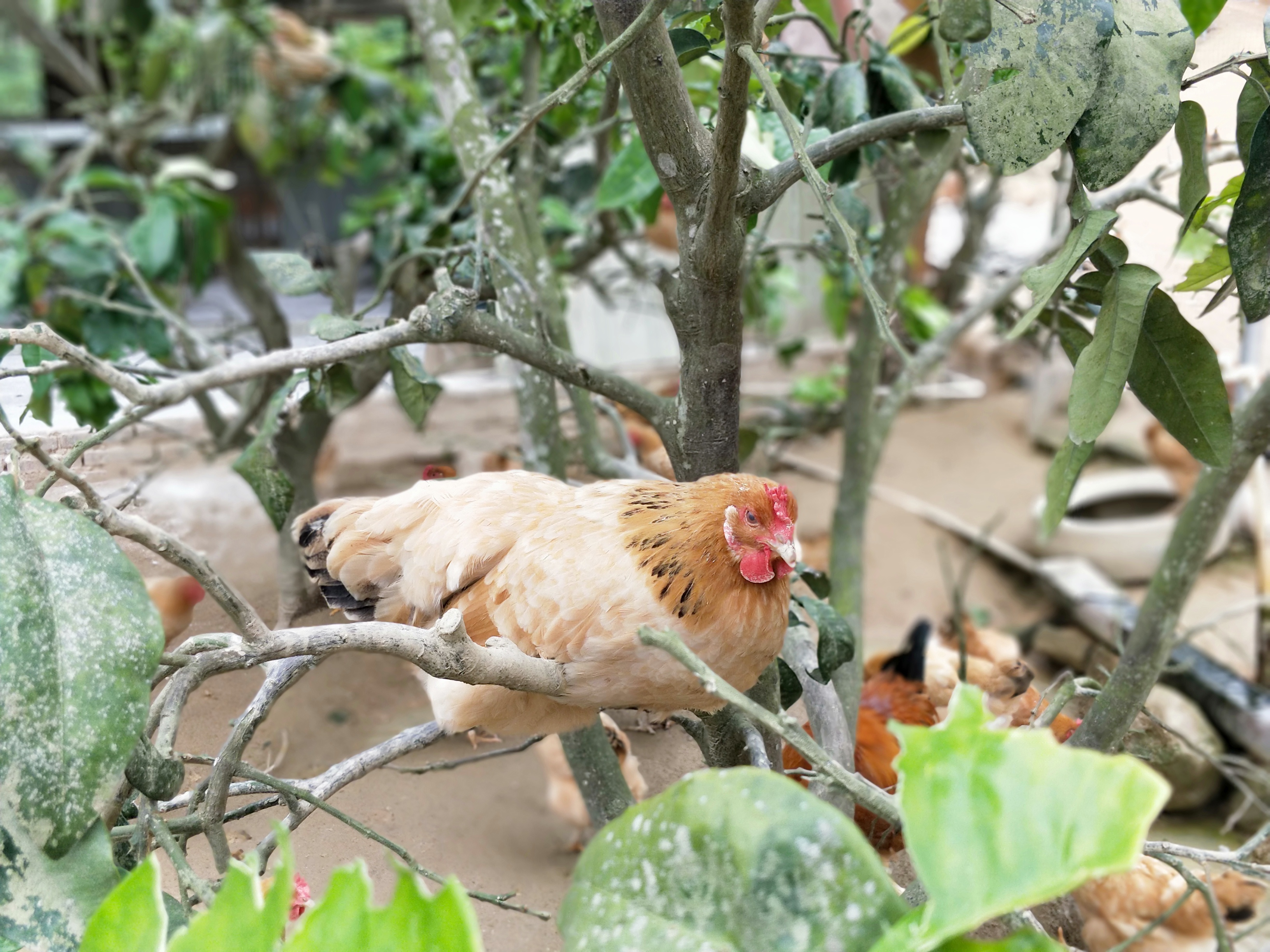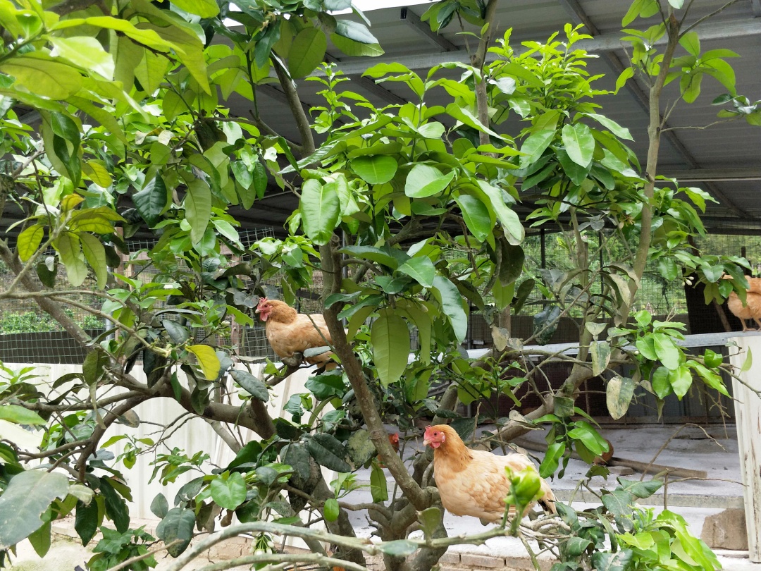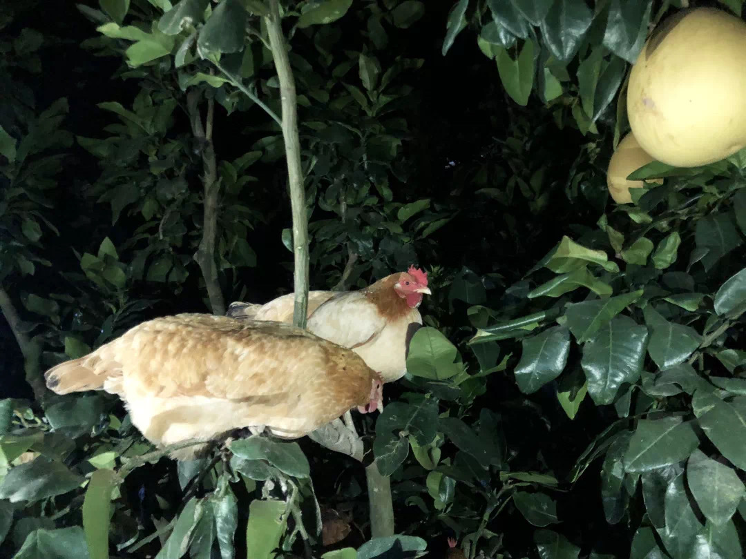树上有果,地下有鸡,午后鸡群在果树下乘凉,晚上直接在果树上过夜。