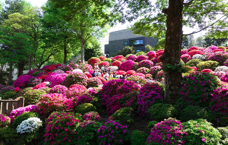 根津神社内最著名的应该是「杜鹃苑」,占地面积大,而且在每年的4月花季时会有100种杜鹃轮番上阵,打造出一副花团锦簇的模样。